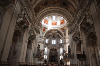 beeindruckendem Barockinterieur. Hier wurde übrigens Mozart getauft.