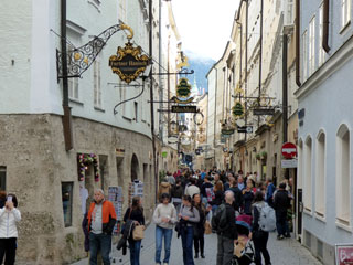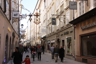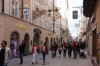 In der berühmten Getreidegasse 🛍️ reiht sich ein hübsches Geschäft ans nächste – viele mit den traditionellen, schmiedeeisernen Schildern, die der Straße ihren besonderen Charme geben.